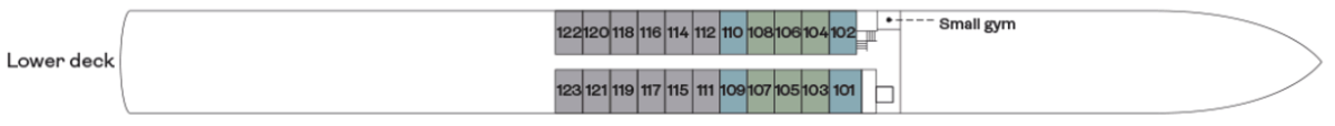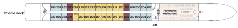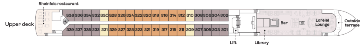All cabins have an average floor plan of 17 square metres. Cabins on the Middle and Upper decks all have French balconies. Cabins on the lower deck are 14 square metres with a high-level window. We also have 12 single cabins.